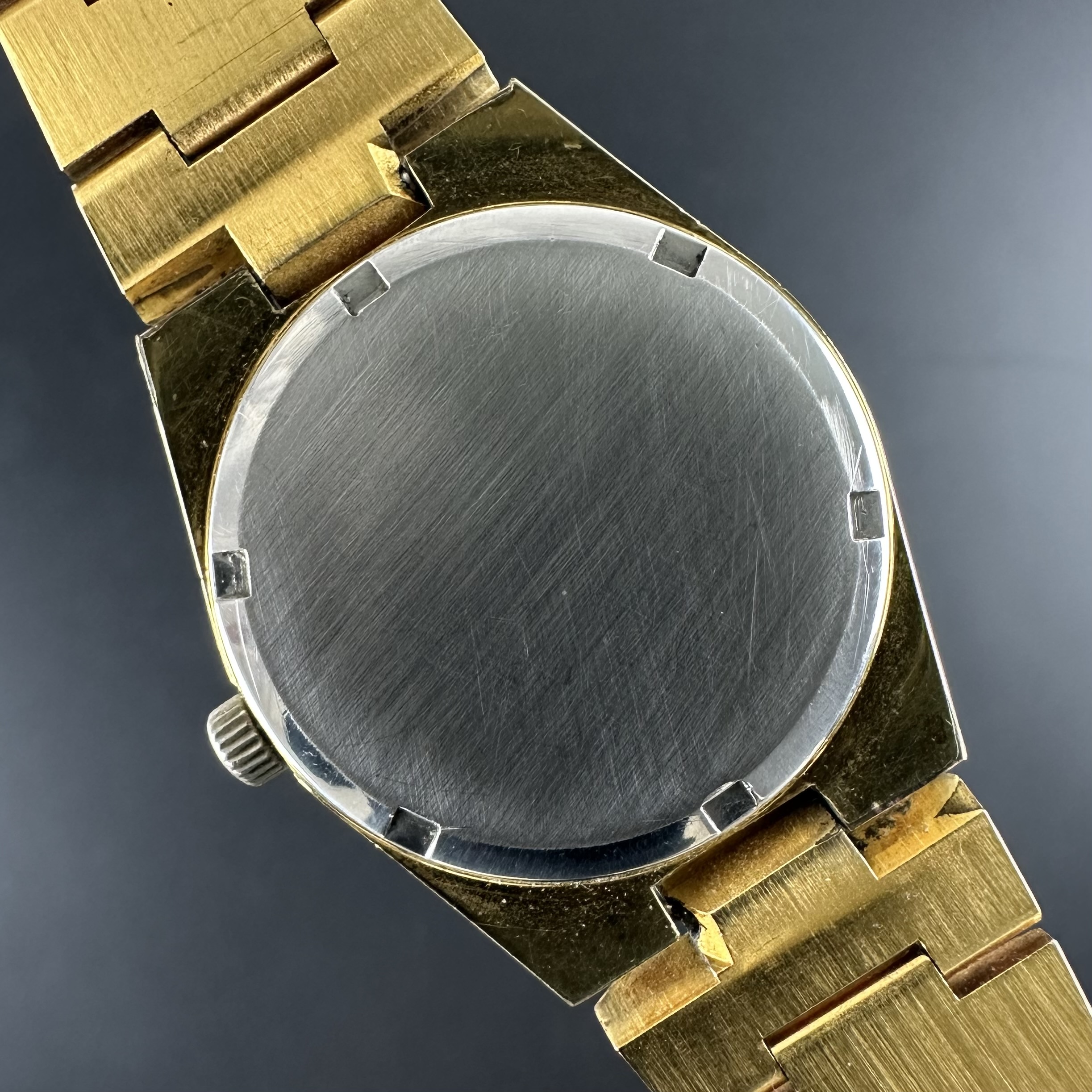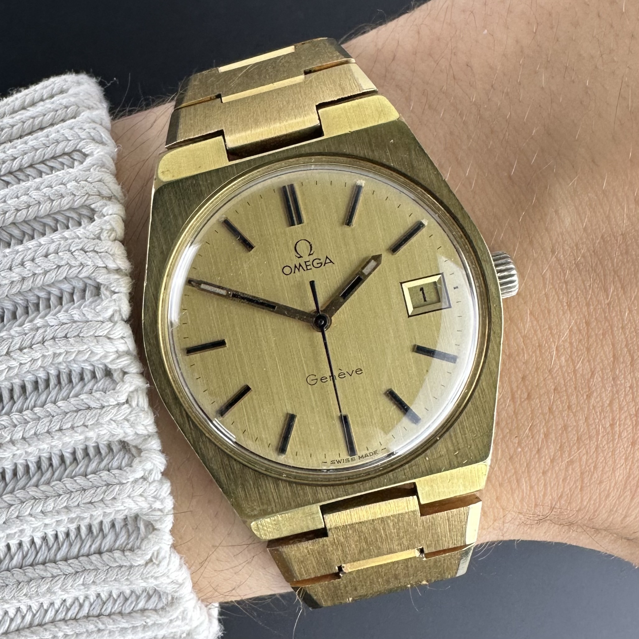 This vintage Omega Genève from 1972 features a gold-plated 35mm case and flat link bracelet with its original polish still visible and great condition on the exterior. Mostly some fading on the inside which is common on this reference. The crown shows wear but remains original. Its vertically brushed dial is in impeccable condition, and the watch is powered by a caliber 613 manual wind movement, serviced in October 2025 and running excellently. A refined example, ideal as a dress watch.